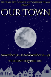 The Ozark Arts Council presents Thornton Wilder’s Our Town performed at the Historic 1929 Lyric Theater November 14–15 and 21–22 at 7:00PM, November 16 and 23 at 2:00PM. Tickets are $15 for adults, $13 for seniors (55+) and students, and $11 for children (11 and under), when bought in advance; prices rise $4 if purchased at the door—$19 for adults, $17 for seniors and students, and $15 for children. Tickets are currently on sale to OAC Members only, and will be open for sale to the general public on October 17; to get in on this early sale opportunity, click through and become an OAC Member today!